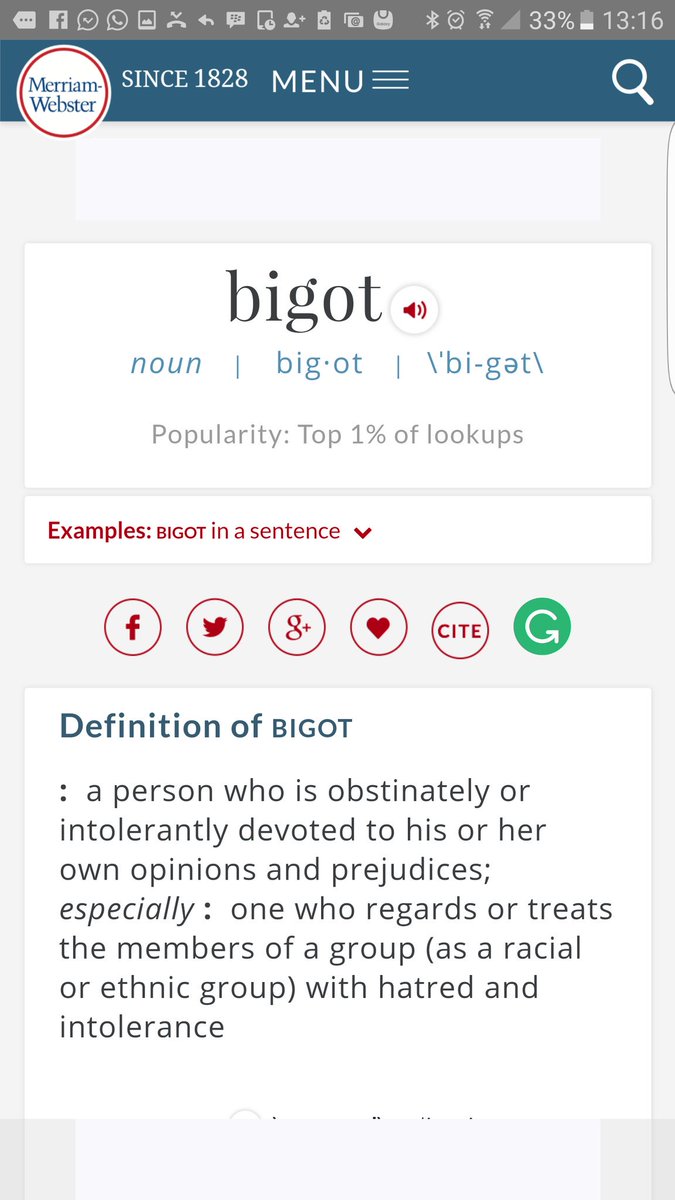 Noun narrow-minded prejudiced person. There is more hypocrisy than bigotry in America. And you do not defend bigots by attacking people who refuse to listen to bigotry pretending to be substantive discussion. It is the only way to combat bigotry on all sides. Im not voting for Trump because he is a bigot who hates minorities. Thats tantamount to being a bigot. Learn how to use Bigot in a sentence and make better sentences with word Bigot by reading from 133 Bigot sentence examples.
